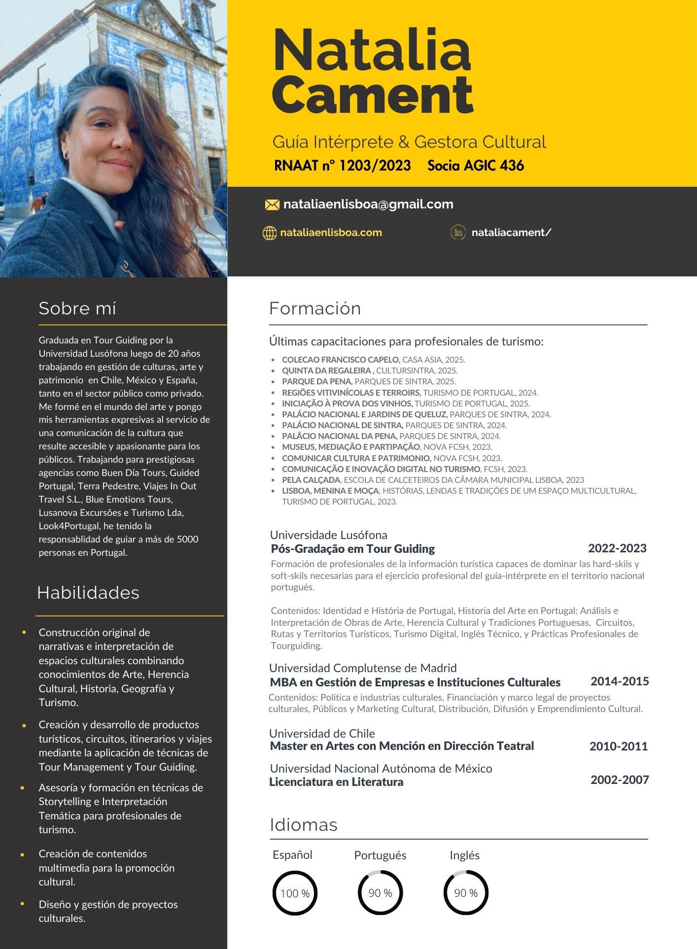 Nada me gusta más que acompañar a otros a descubrir rincones e historias fascinantes. ¿Por qué? Es que estoy convencida de que conocer el mundo puede ser una herramienta poderosa de paz (porque lo que se quiere se cuida), y no solo eso: es una manera entretenida de entender mejor nuestra propia historia.Yo te garantizo que dejarás la ciudad con ganas de volver, pero si además de eso consigo que este viaje te haga ver cualquier lugar con nuevos ojos: ése es el mejor souvenir.Estás en buenas manos: luego de vivir en diferentes países y viajar mucho, me especialicé en cultura e historia de Portugal y me formé como guía intérprete aquí en la Universidad Lusófona de Lisboa. Como vengo del mundo del arte y las comunicaciones, te prometo que la experiencia será tan enriquecedora como entretenida. Ya he acompañado a más de 2000 personas en Portugal y me encantaría que tú fueras la próxima.¿Te animas? ;)