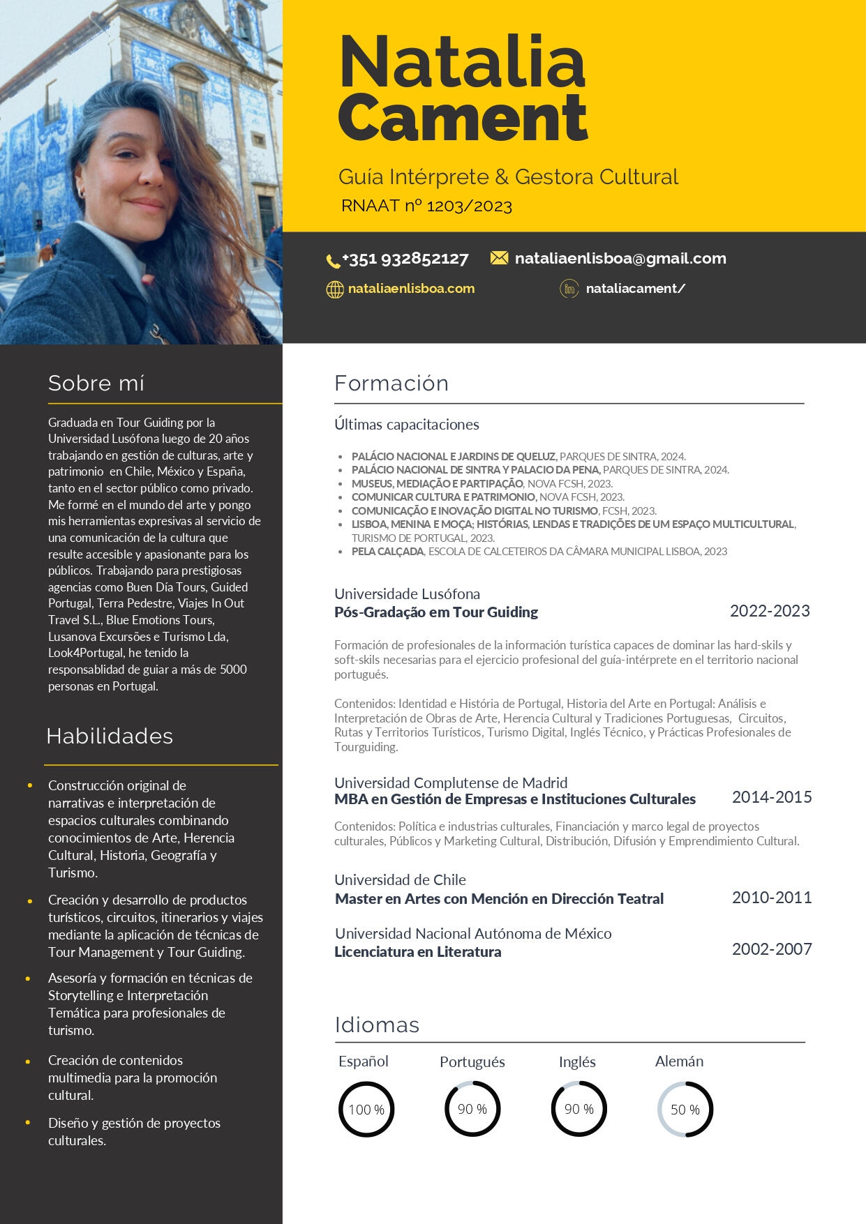 Nada me gusta más que acompañar a otros a descubrir rincones e historias fascinantes. ¿Por qué? Es que estoy convencida de que conocer el mundo puede ser una herramienta poderosa de paz (porque lo que se quiere se cuida), y no solo eso: es una manera entretenida de entender mejor nuestra propia historia.Yo te garantizo que dejarás la ciudad con ganas de volver, pero si además de eso consigo que este viaje te haga ver cualquier lugar con nuevos ojos: ése es el mejor souvenir.Estás en buenas manos: luego de vivir en diferentes países y viajar mucho, me especialicé en cultura e historia de Portugal y me formé como guía intérprete aquí en la Universidad Lusófona de Lisboa. Como vengo del mundo del arte y las comunicaciones, te prometo que la experiencia será tan enriquecedora como entretenida. Ya he acompañado a más de 2000 personas en Portugal y me encantaría que tú fueras la próxima.¿Te animas? ;)